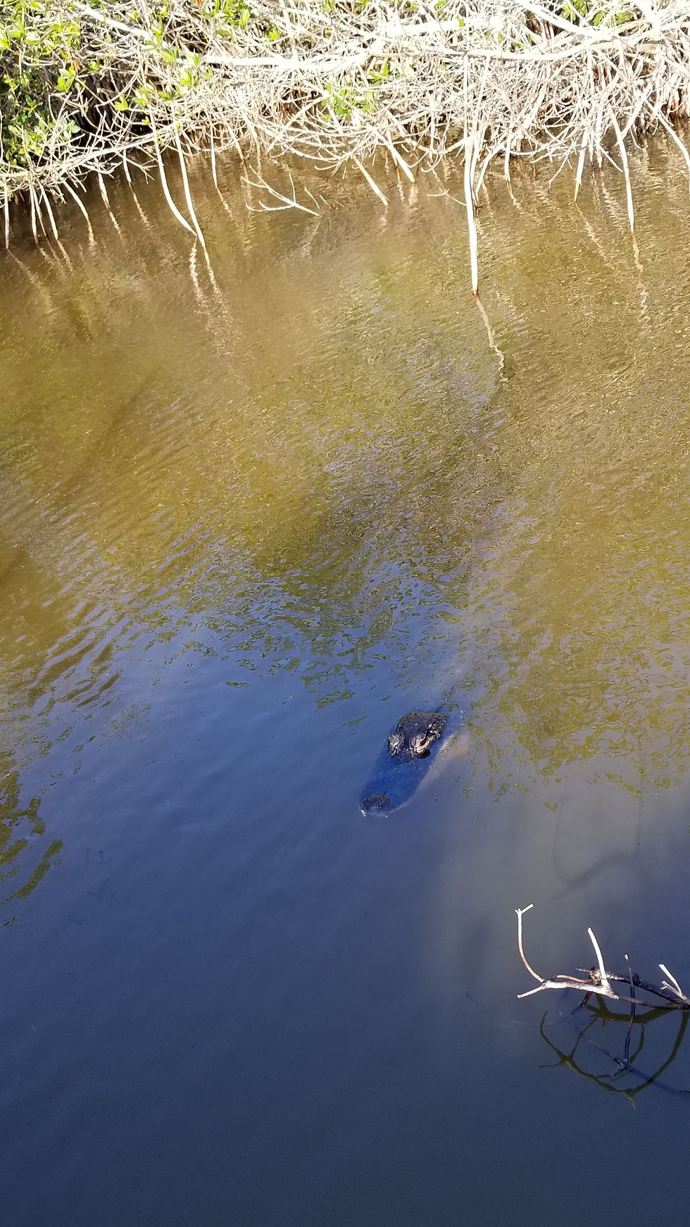On our way back down the trail it had warmed up enough that the alligators made their appearance. This one was vaguely reminiscent of Georgia when he sank down and I kayaked over him...