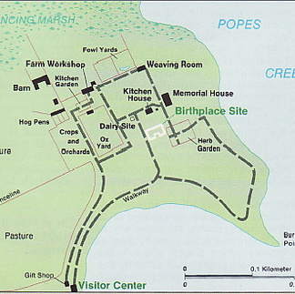 The home that you can see in the top, right was actually designed for george washington's two hundredth birthday in 1932. Inside it is beautifully decorated with period pieces, but none of them were the Washingtons'. The room that you can see with the spinning wheel is to the left of the main house and is also typical of the period. Unfortunately, you can't see the workshop in the photo, but it is back and to the left of the small building with the spinning wheel. They're actually gearing up for George's three hundredth birthday, so perhaps Mike and I will actually have to come back and see the updated park movie and other exhibits. We've been told they're going to do more with the native tribes in the area who lived along the Pope River long before the Washington's.